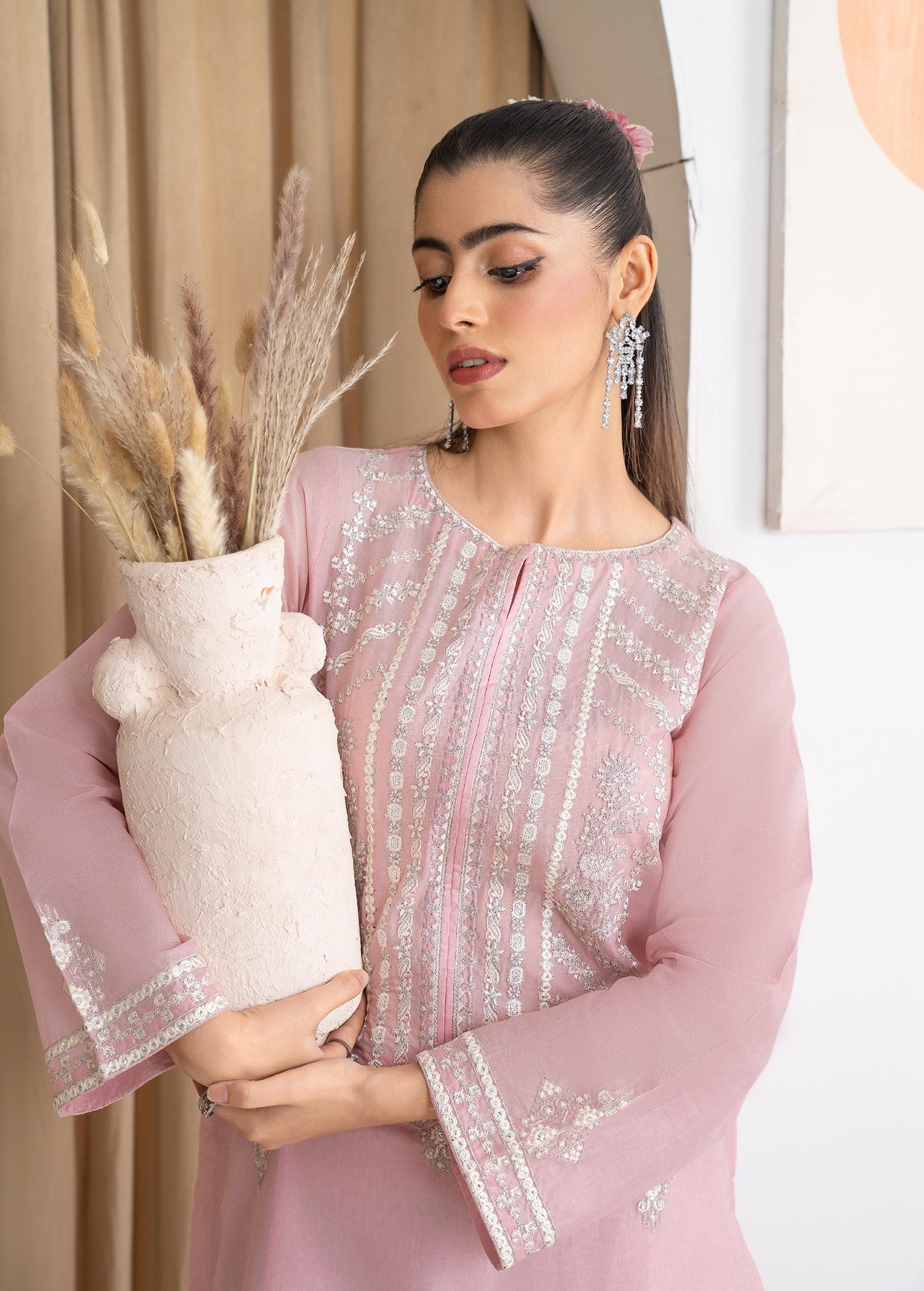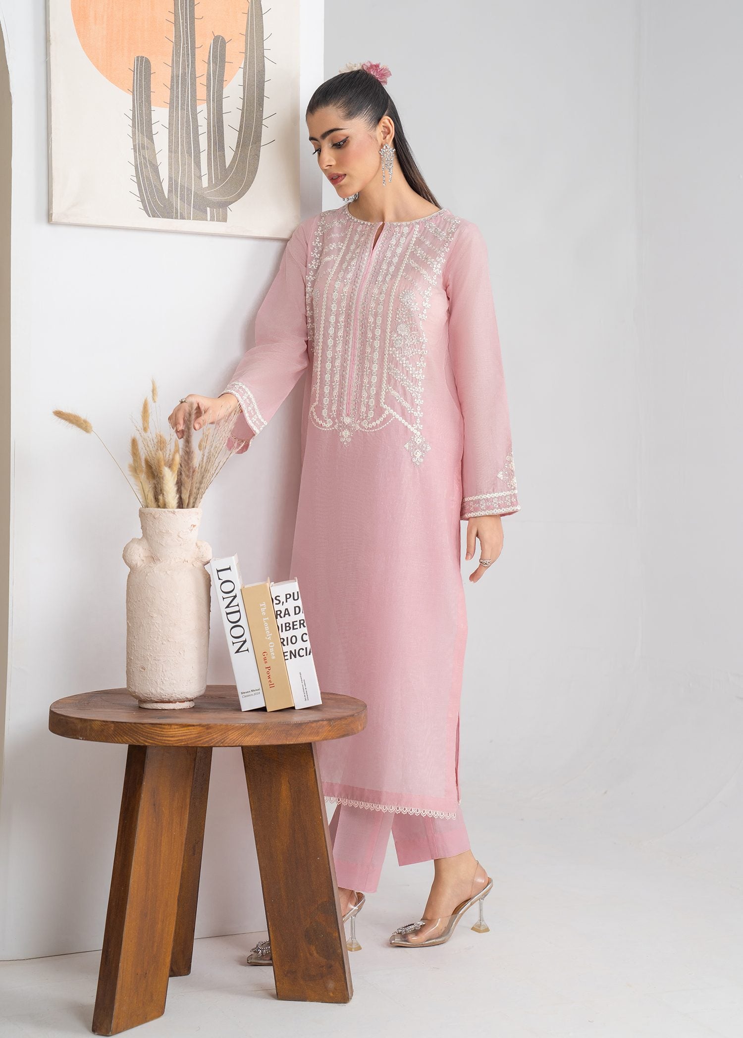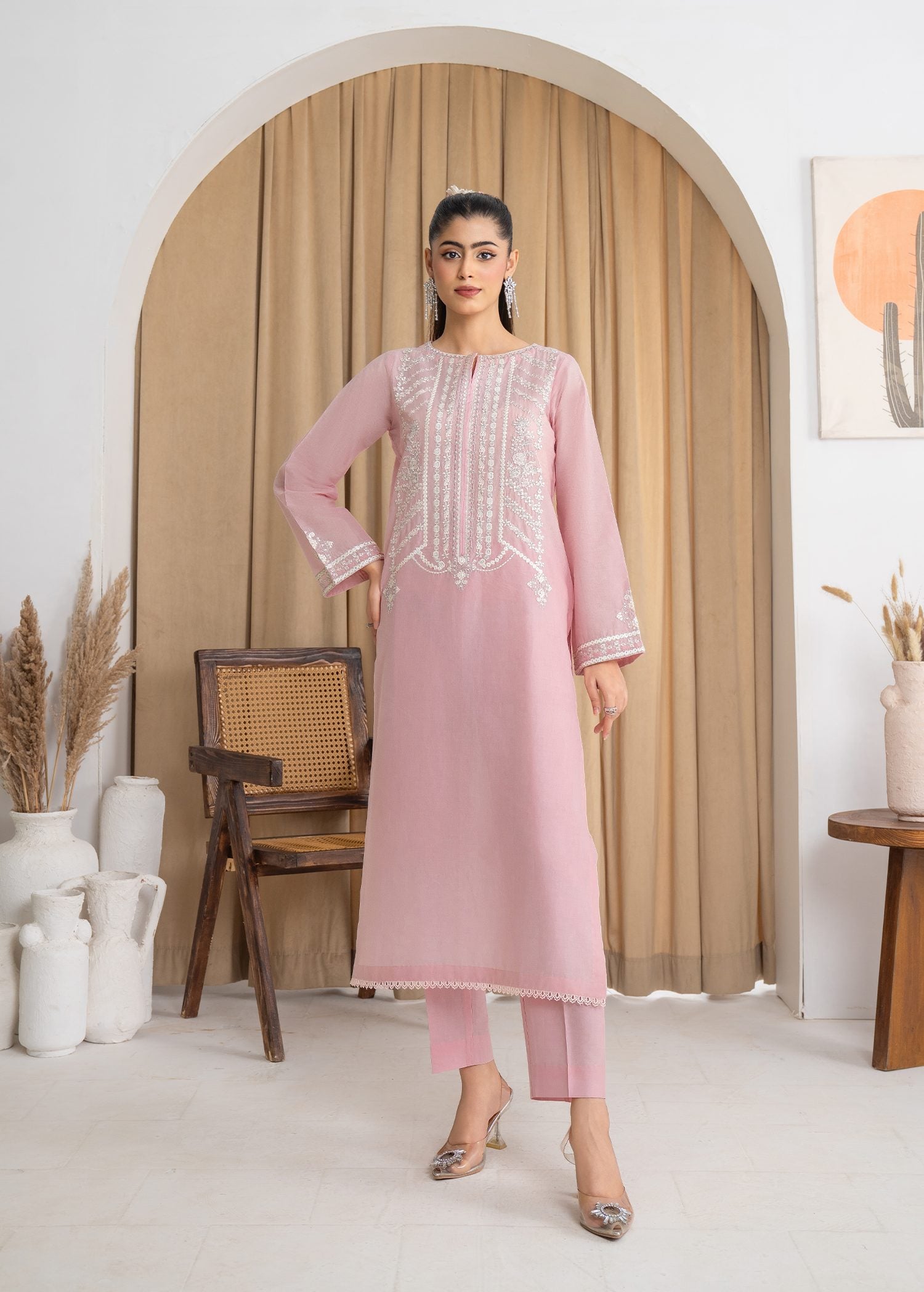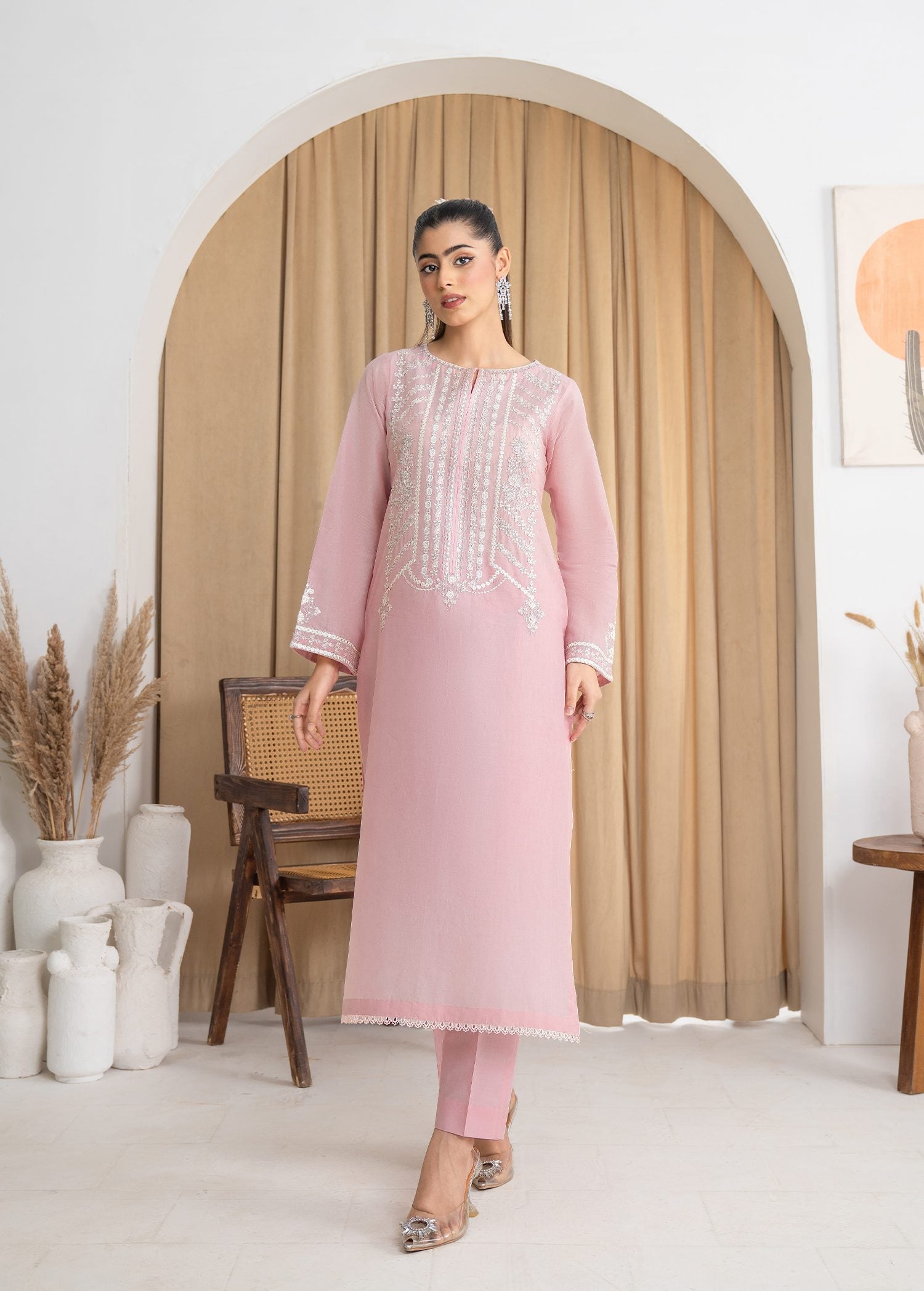 The elegant lawn outfit showcases detailed and intricate embroidery on the neckline and sleeves, adding a touch of refinement to the overall look. Paired with matching trousers, it offers a perfect balance of grace and style.