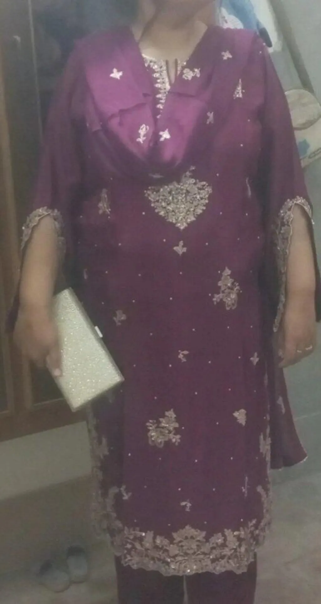 An enchanting silk ensemble adorned with intricate embroidery, shimmering sequins, and delicate handwork beautifully highlighting the neckline, elegant sleeves, and shirt borders. The outfit features a graceful all-over floral spray of embroidery and sequins, adding charm and artistic elegance. Styled with a finely embroidered dupatta and smooth silk trousers, this look reflects refined sophistication with a touch of festive allure.