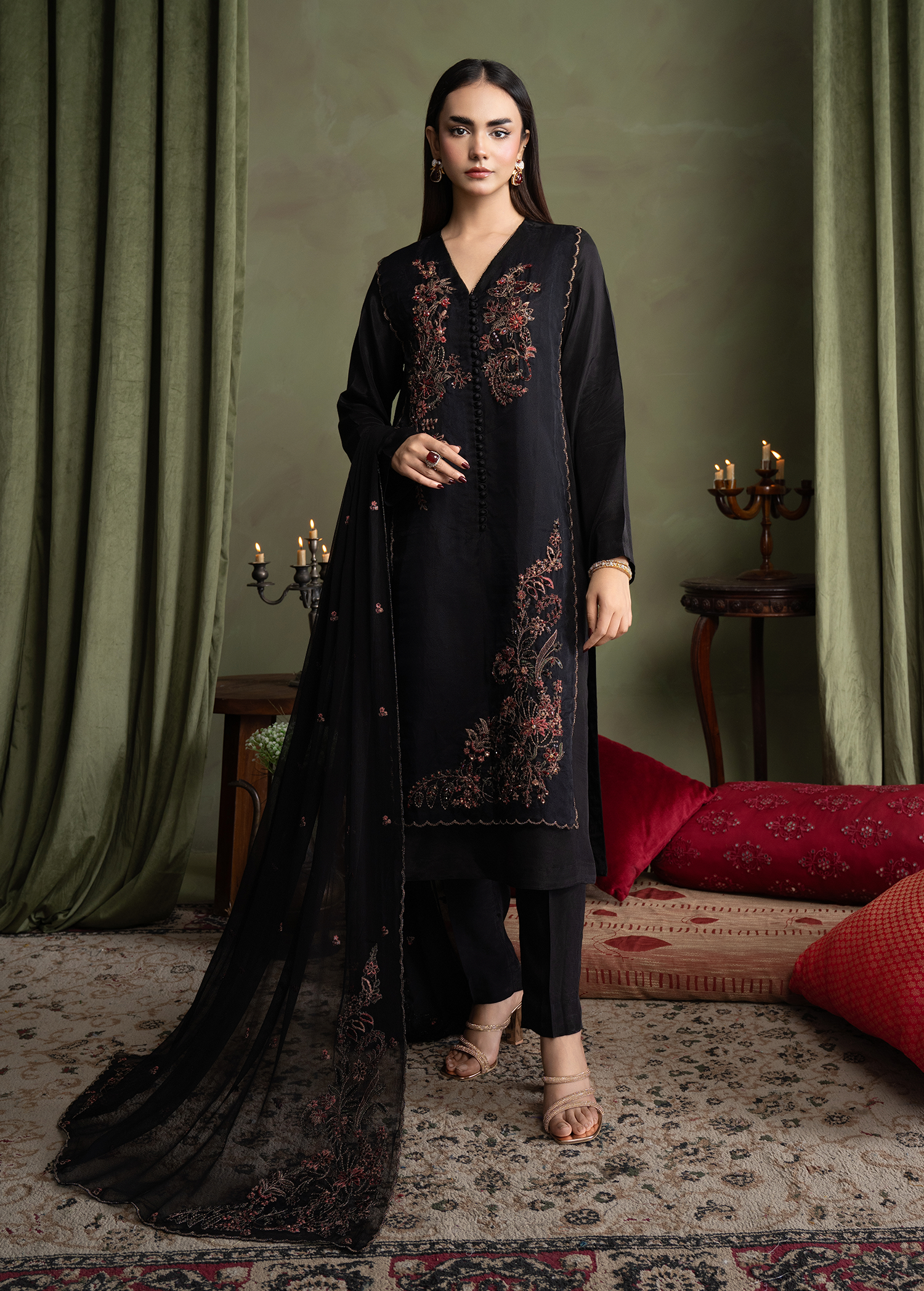 The elegant silk outfit features a V-shaped neckline with button detailing and a delicately embroidered organza overlay, adorned with hand embellishments on both sides of the chest and along the side borders. The shirt is lined with soft silk for added richness, paired with a beautifully embroidered crinkle dupatta and matching trousers for a sophisticated finish.