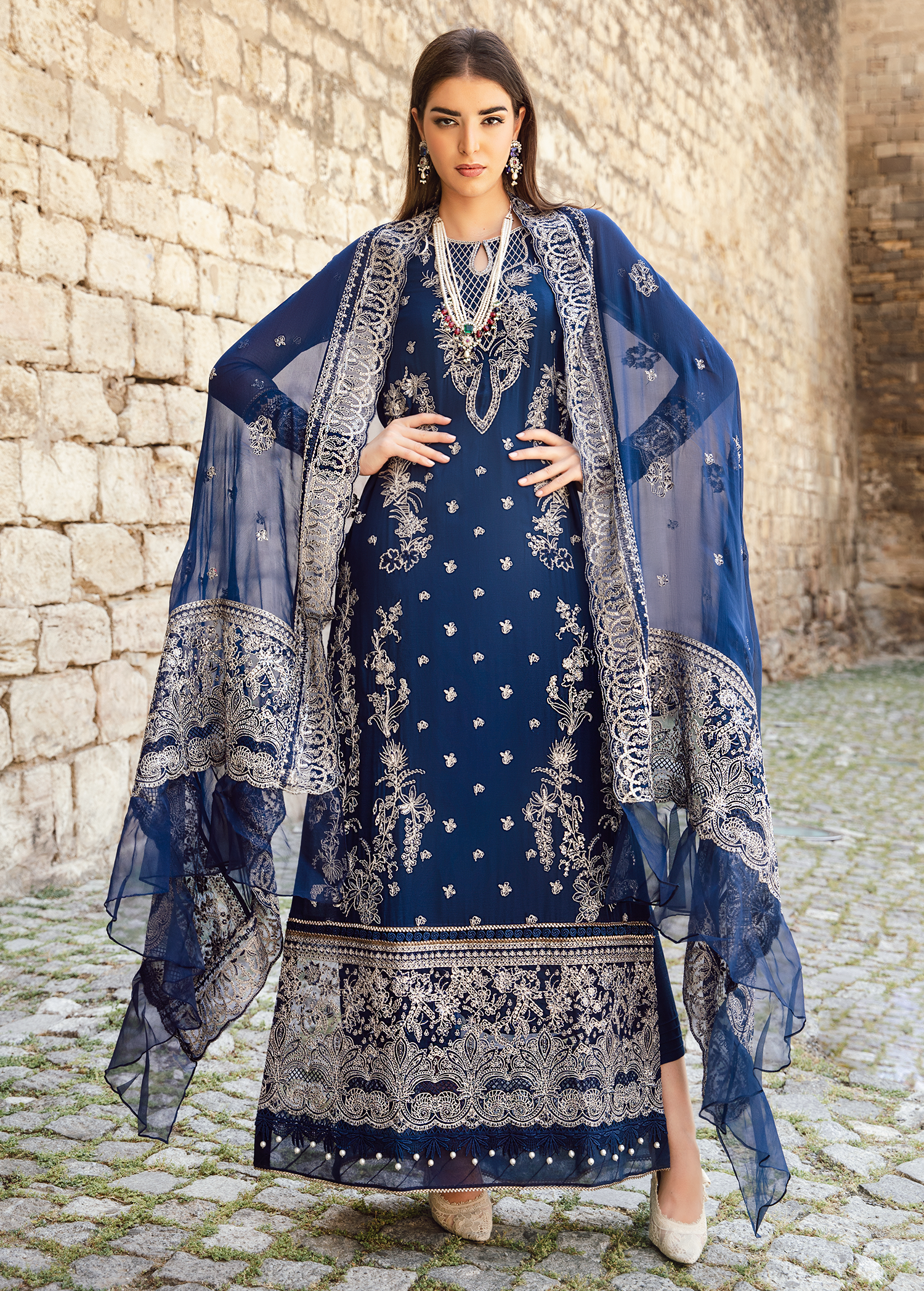Radiating refined artistry, this crinkled ensemble showcases ornate embroidery along the neckline and borders, complemented by elegant floral motifs and a scattered spray embellished with luminous tilla and hand-crafted accents. A fully embroidered dupatta with intricate detailing and matching trousers complete the graceful look.