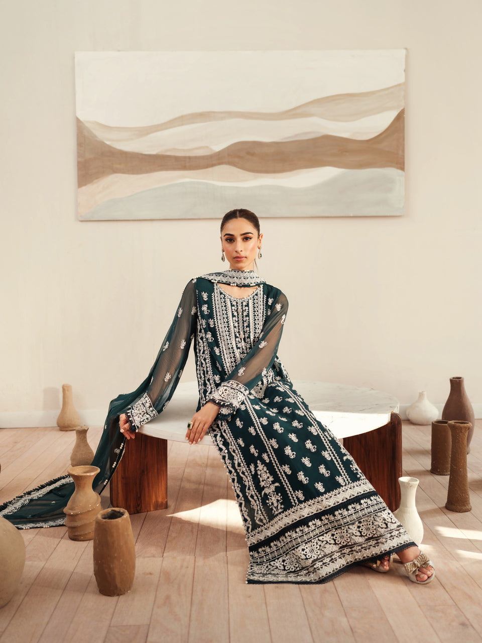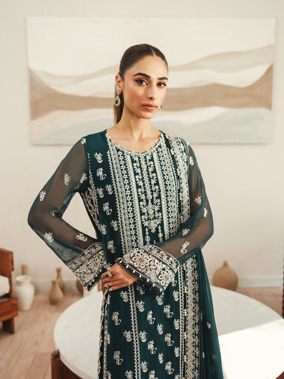 Neysa is a 4-piece emerlad coloured ensemble entails a shirt with proficiently crafted handwork and schiffli on its neckline, sleeves and borders. Over the canvas of embroidery on borders and all over spary on chiffon duppatta, the outfit marks beauty and style statement. It comes with a dyed silk inner and trousers.