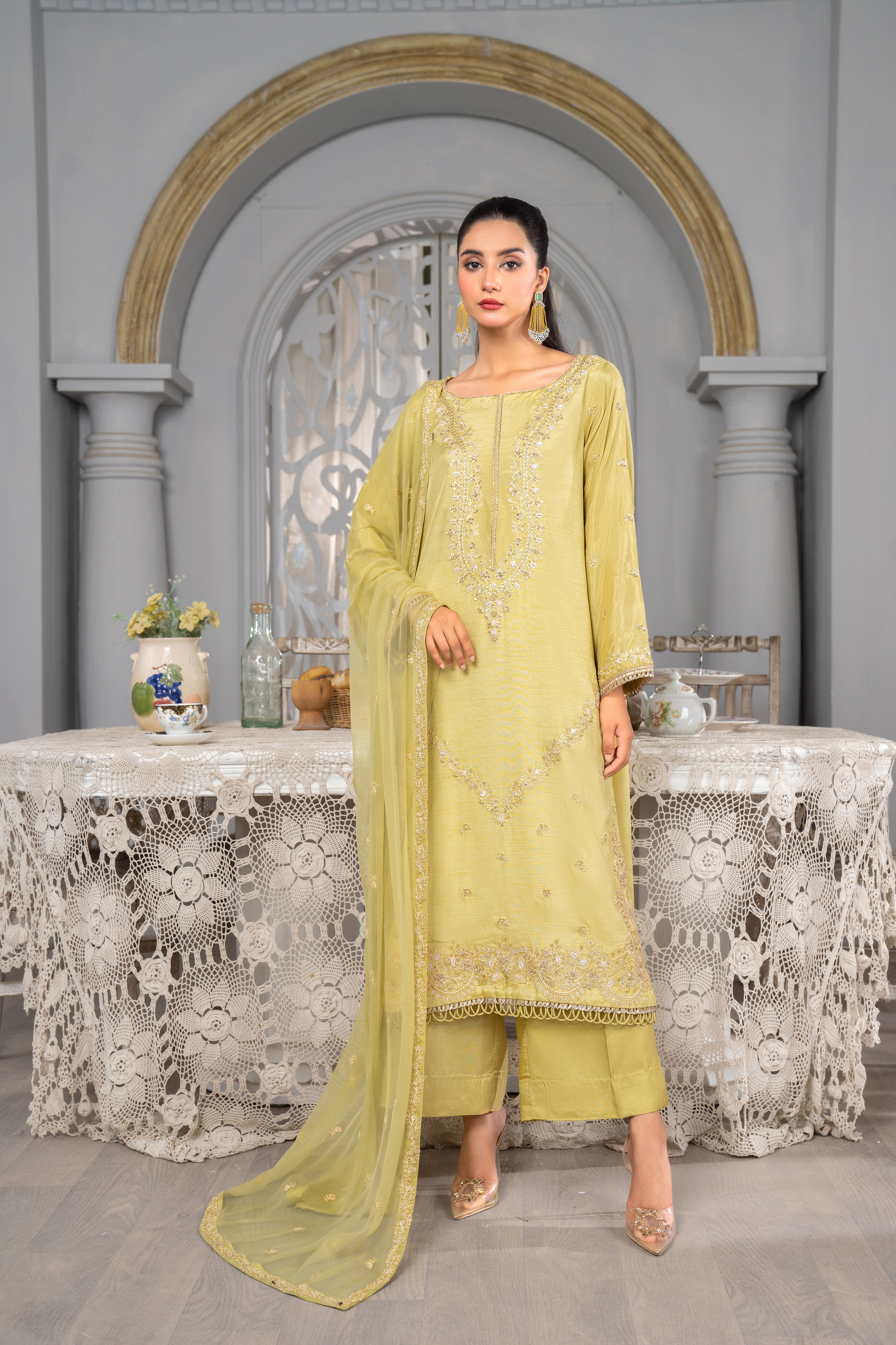 This outfit is embroidered in thread and Tilla all over the shirt. It is paired with chiffon dupatta with spray all over and silk trousers.