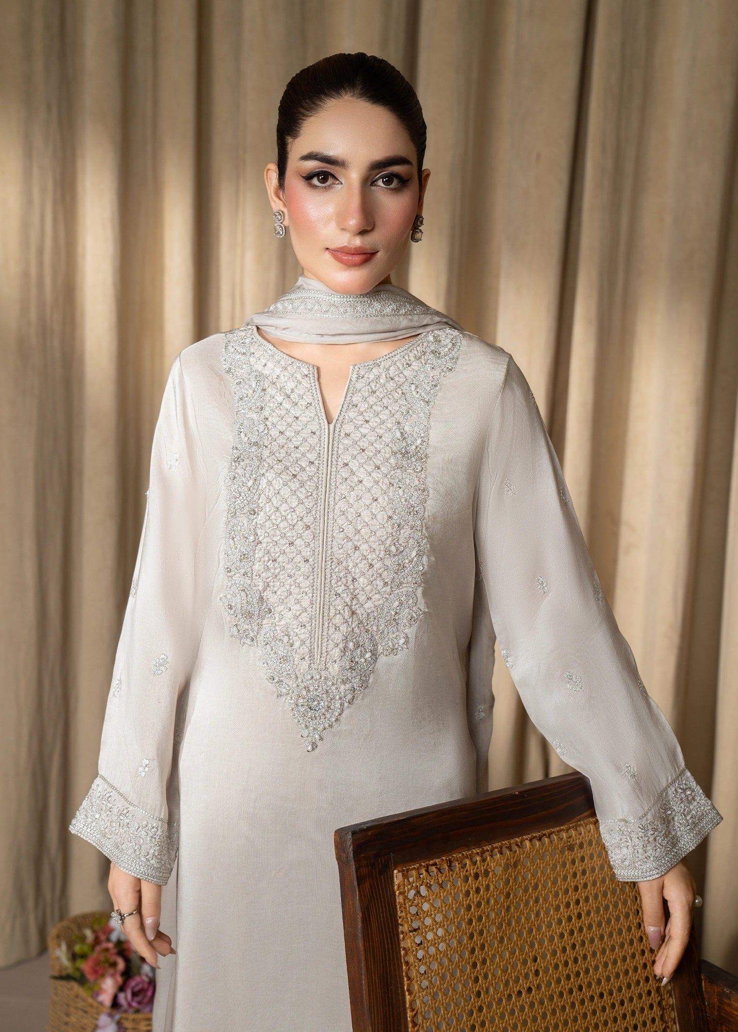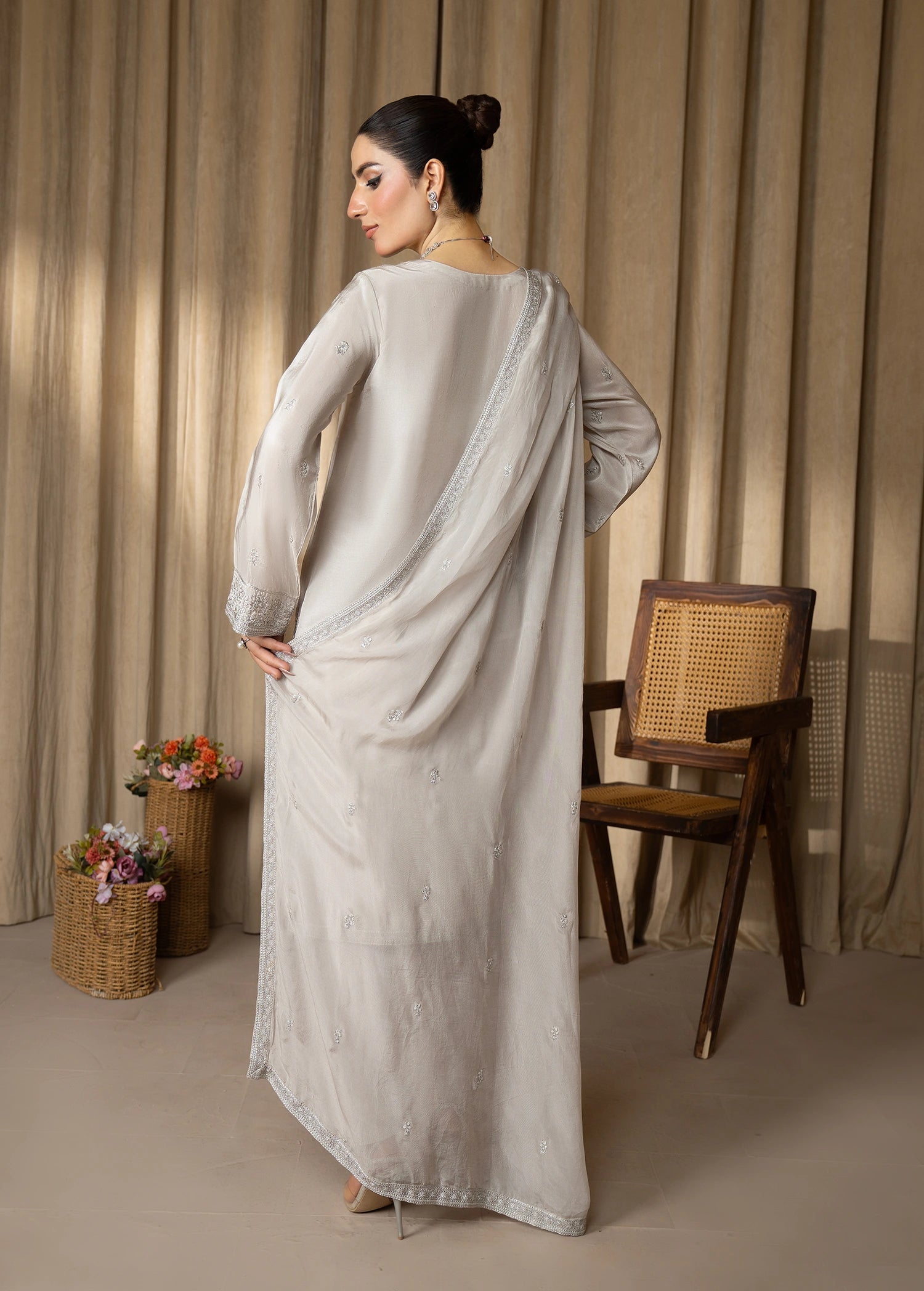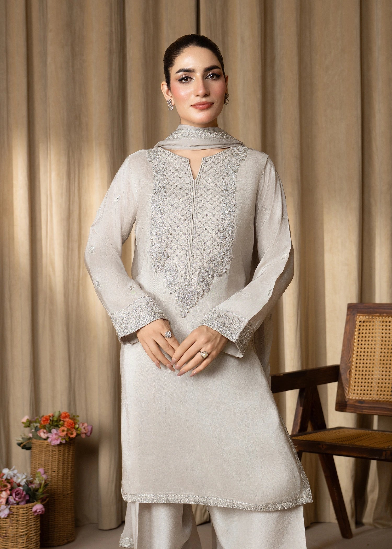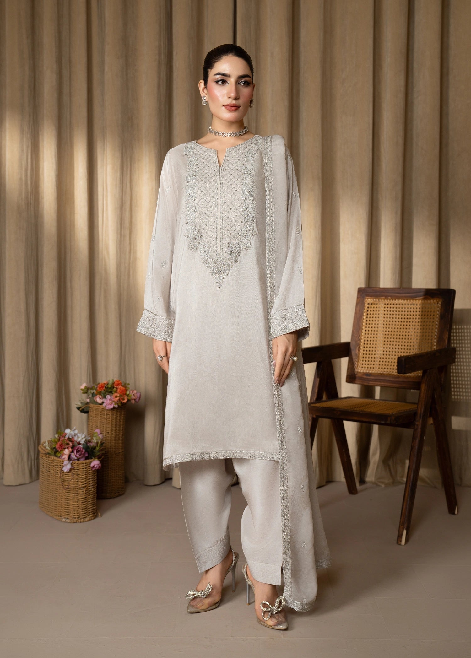 The exquisite silk ensemble features detailed embroidery and delicate hand embellishments on the neckline and sleeves, enhanced with a subtle spray on the sleeves. It is paired with a beautifully embroidered dupatta and a matching shalwar, creating an effortlessly elegant and polished outfit.
