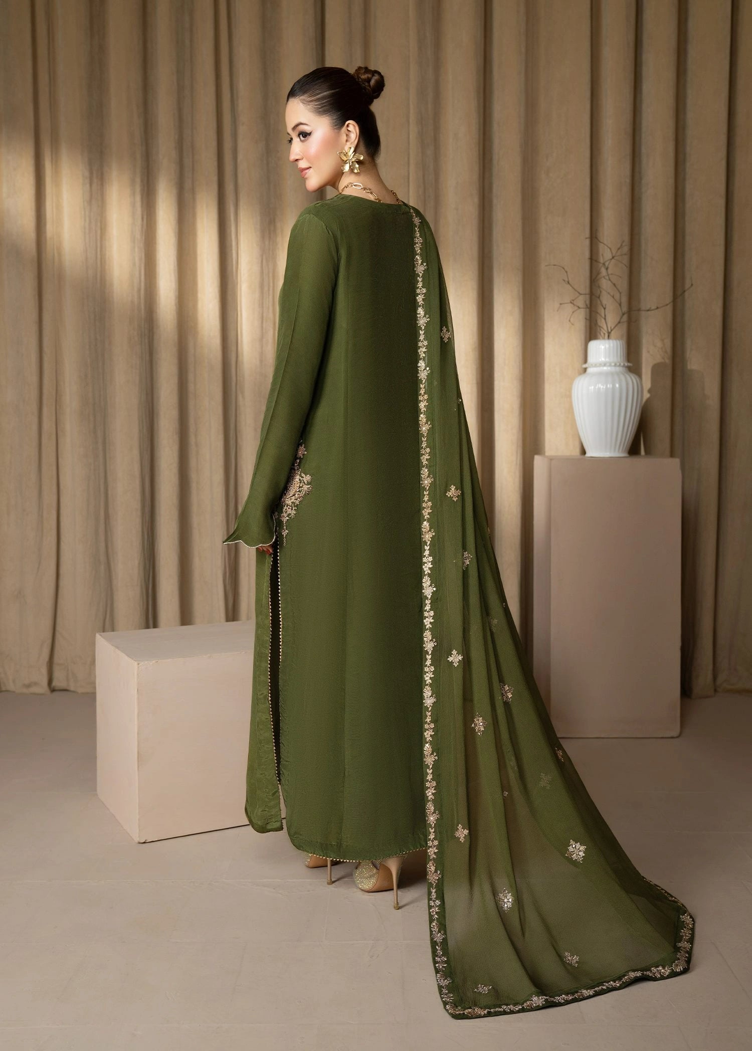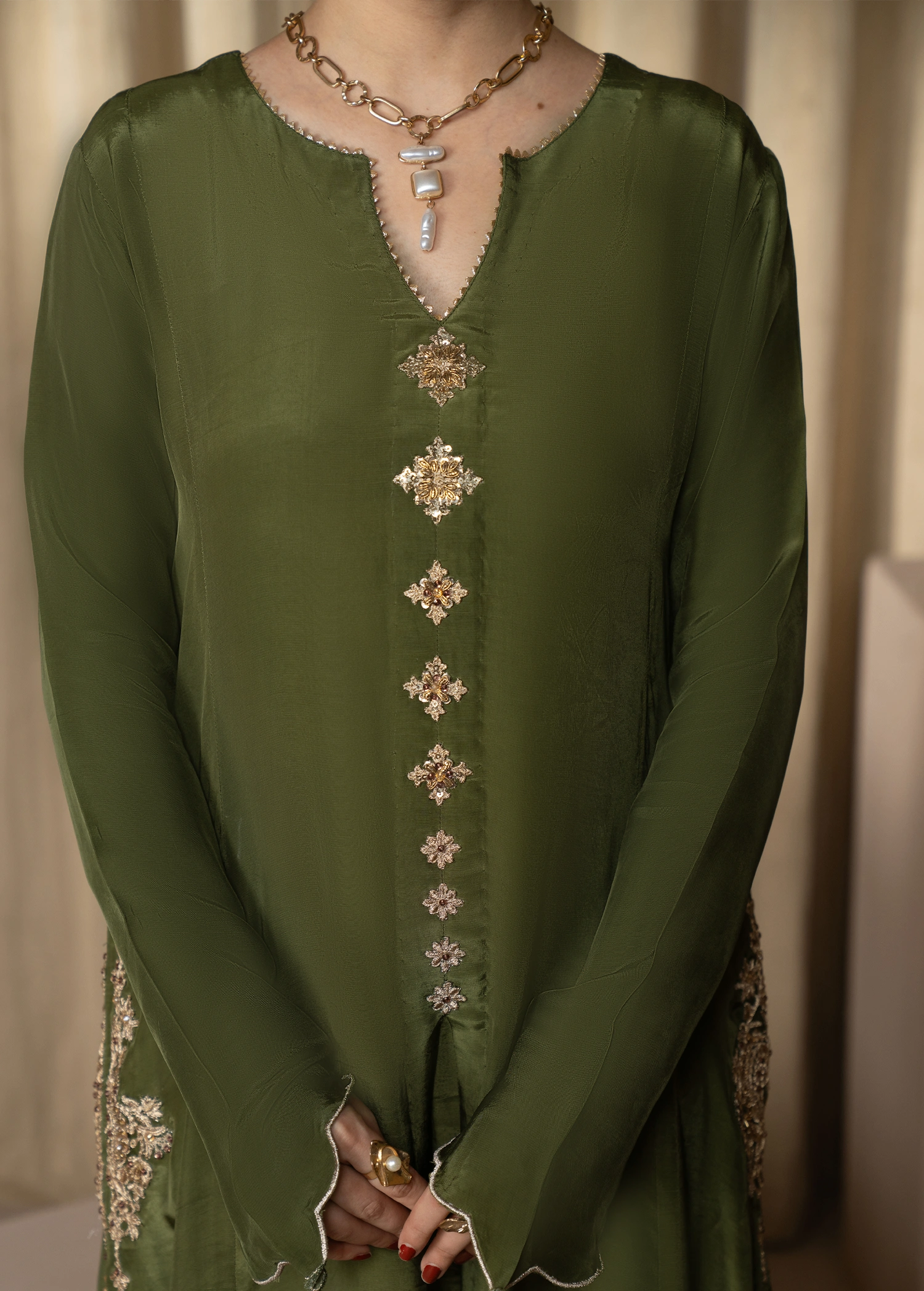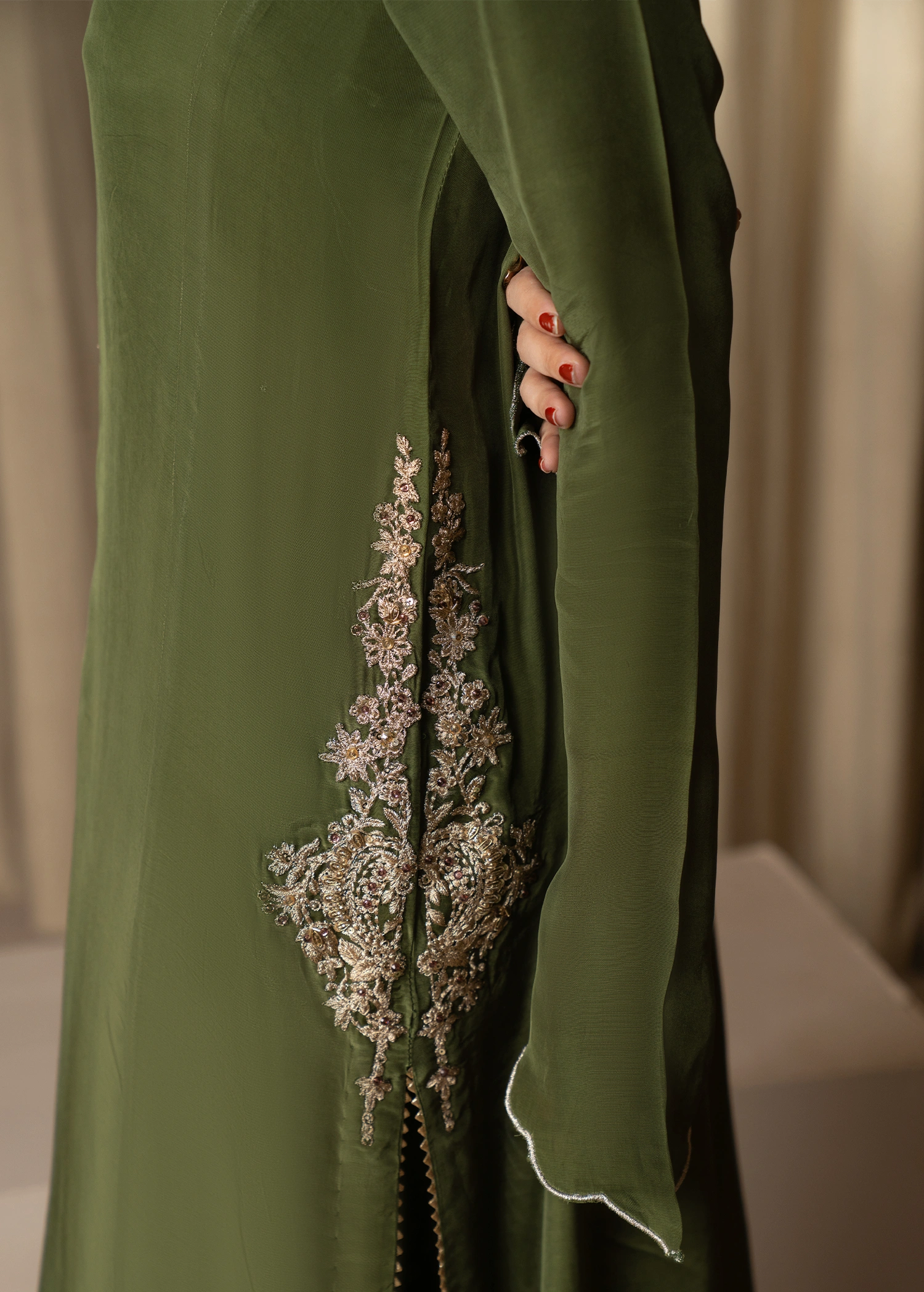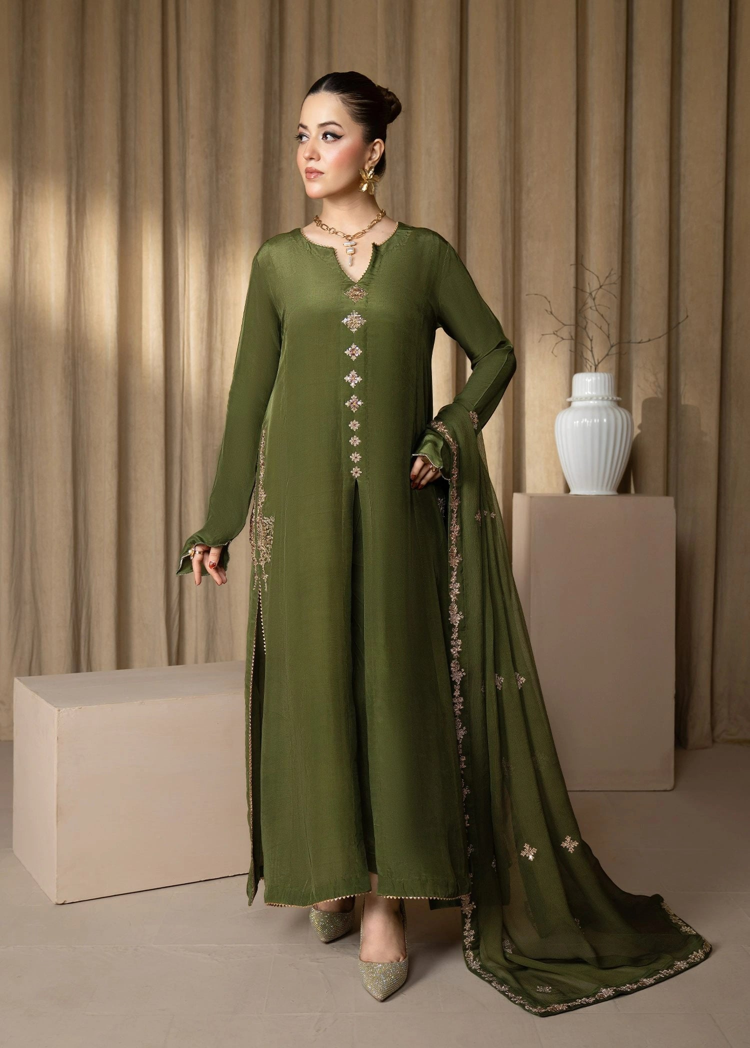 The stylish long front open shirt features a V-shaped neckline adorned with delicate buttons and finished with elegant lace detailing on the neckline, sleeves, and hem. Paired with a beautifully embroidered dupatta and matching trouser, it offers a chic and graceful look.