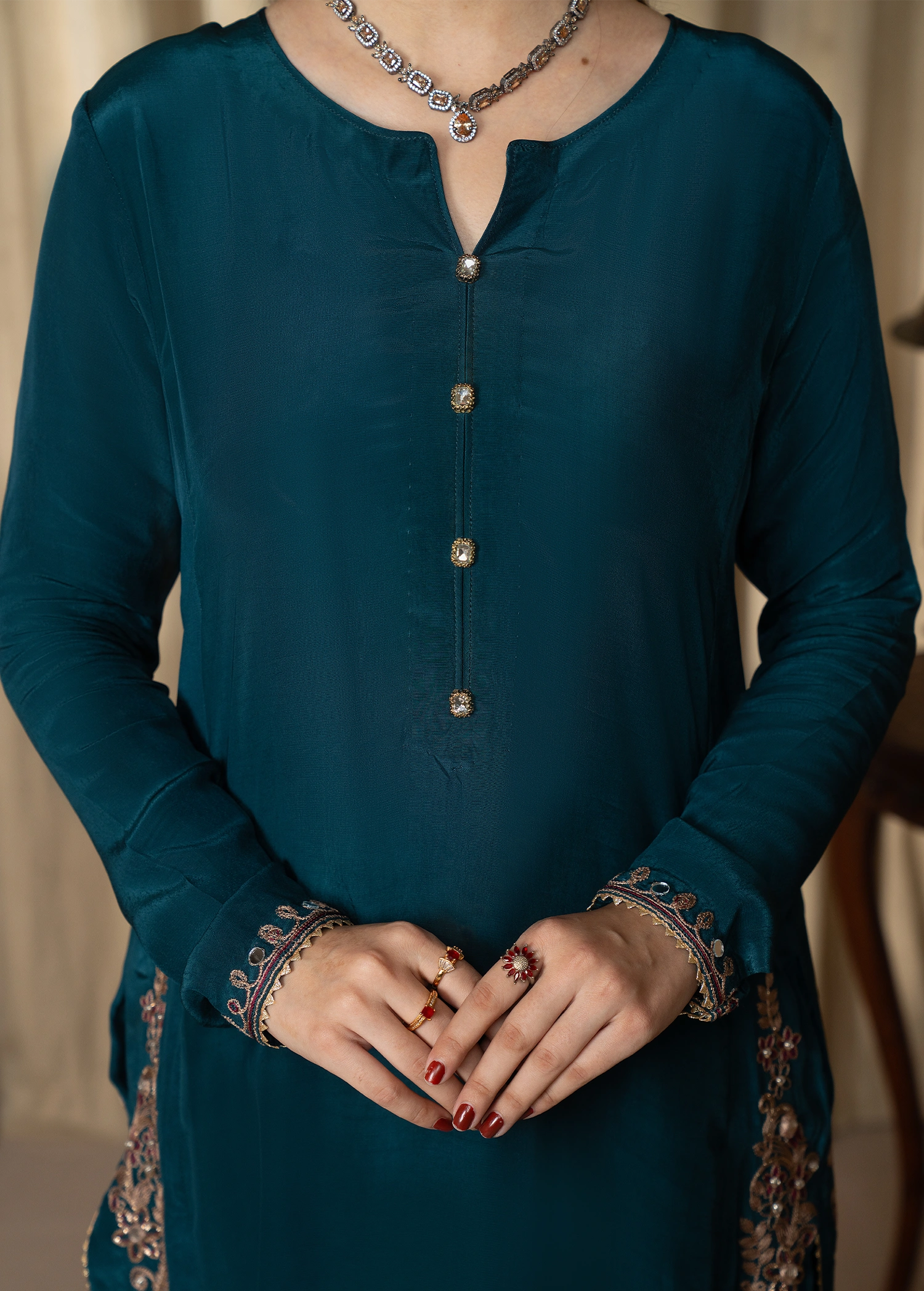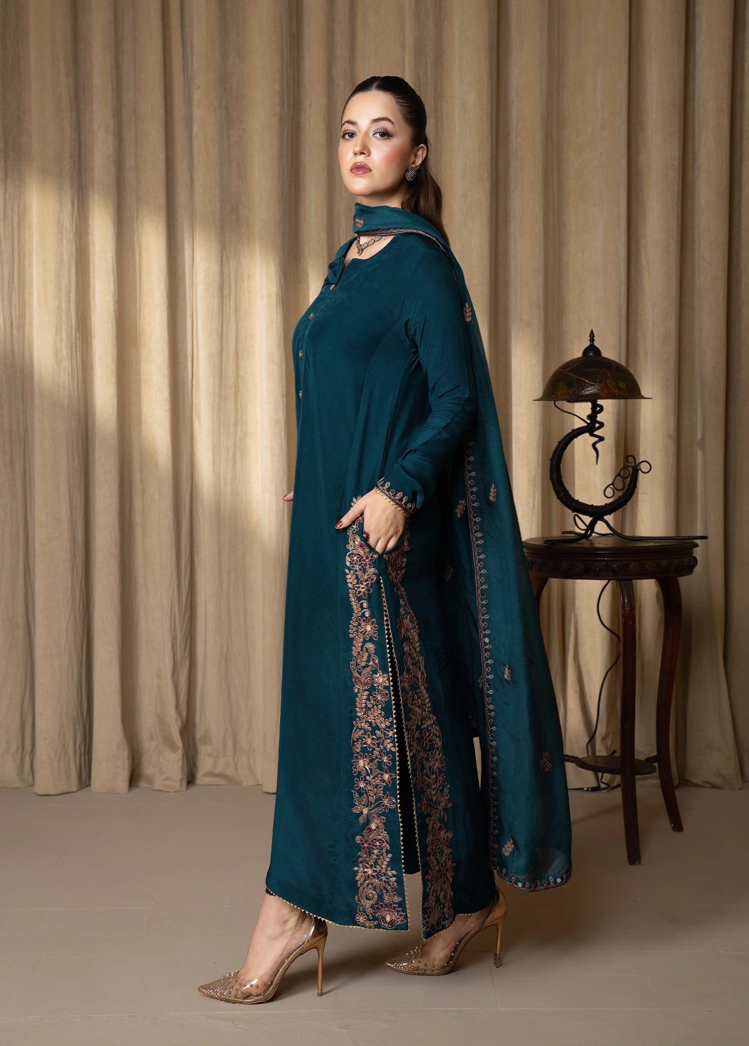 The long shirt features button detailing on the neckline, complemented by elegant embroidery on the sleeves and side borders, accented with delicate lace. The ensemble is completed with a beautifully embroidered dupatta and matching trousers for a refined look.
