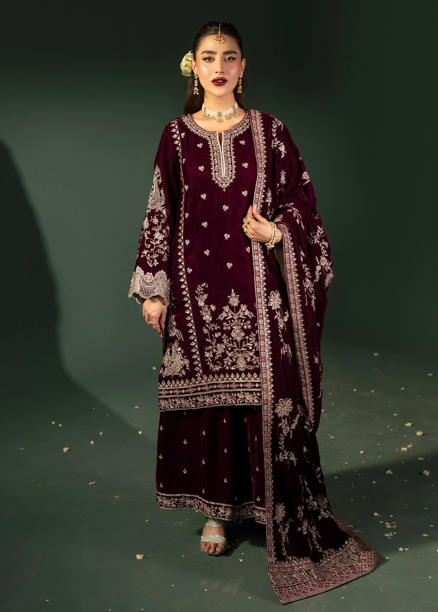 Introducing Our Embroidered Velvet Formal This luxurious ensemble is crafted from pure velvet, featuring intricate embroidery and sequins on the neckline, borders, side panels and sleeves, with a delicate all-over embroidered spray for added charm. Paired with a dyed pure velvet back and embroidered matching trousers, this outfit radiates sophistication and refined style—perfect for making an unforgettable statement at any formal occasion.